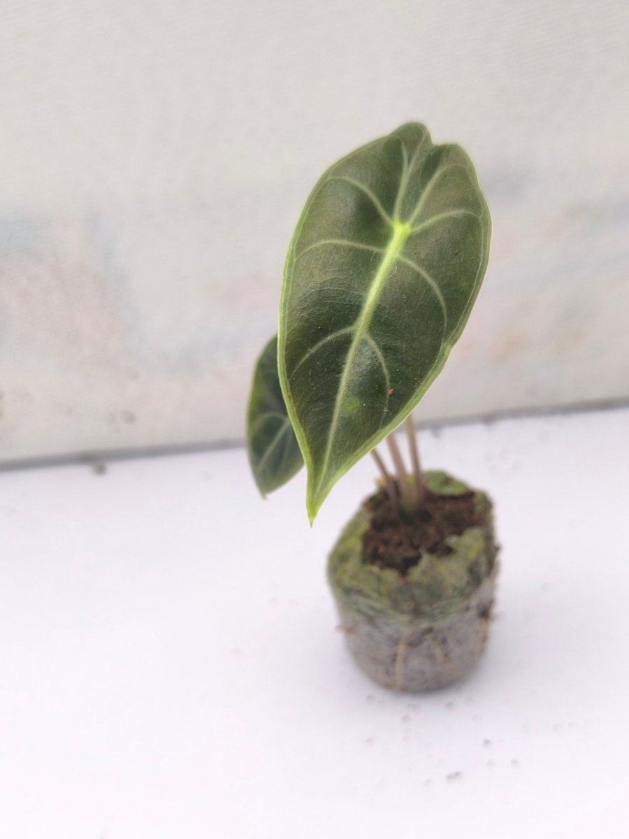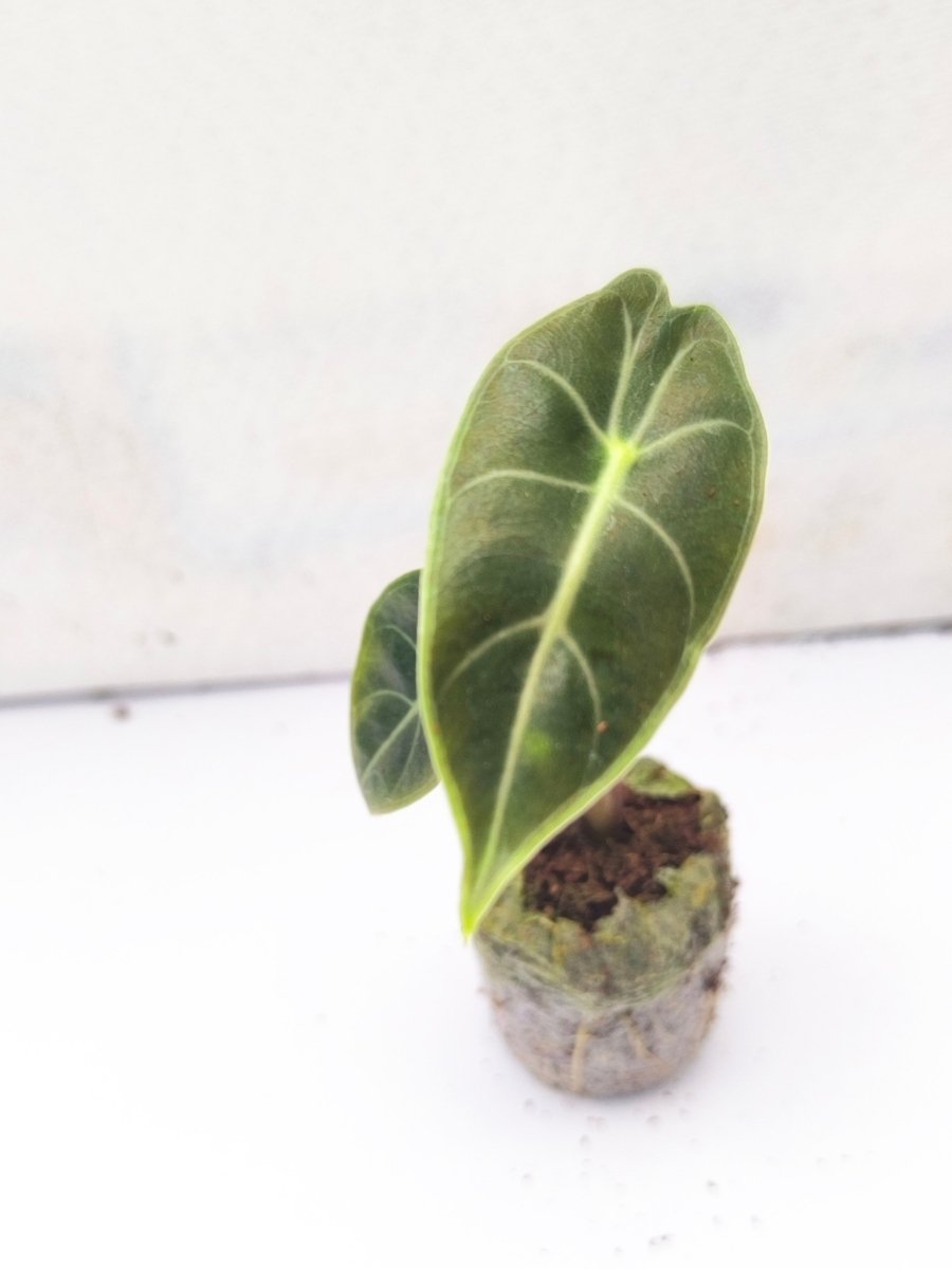 A healthy Alocasia Pink Princess Plant in a jiffy bag