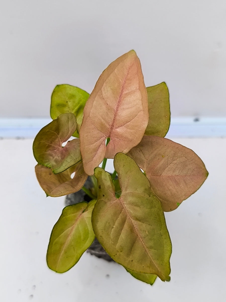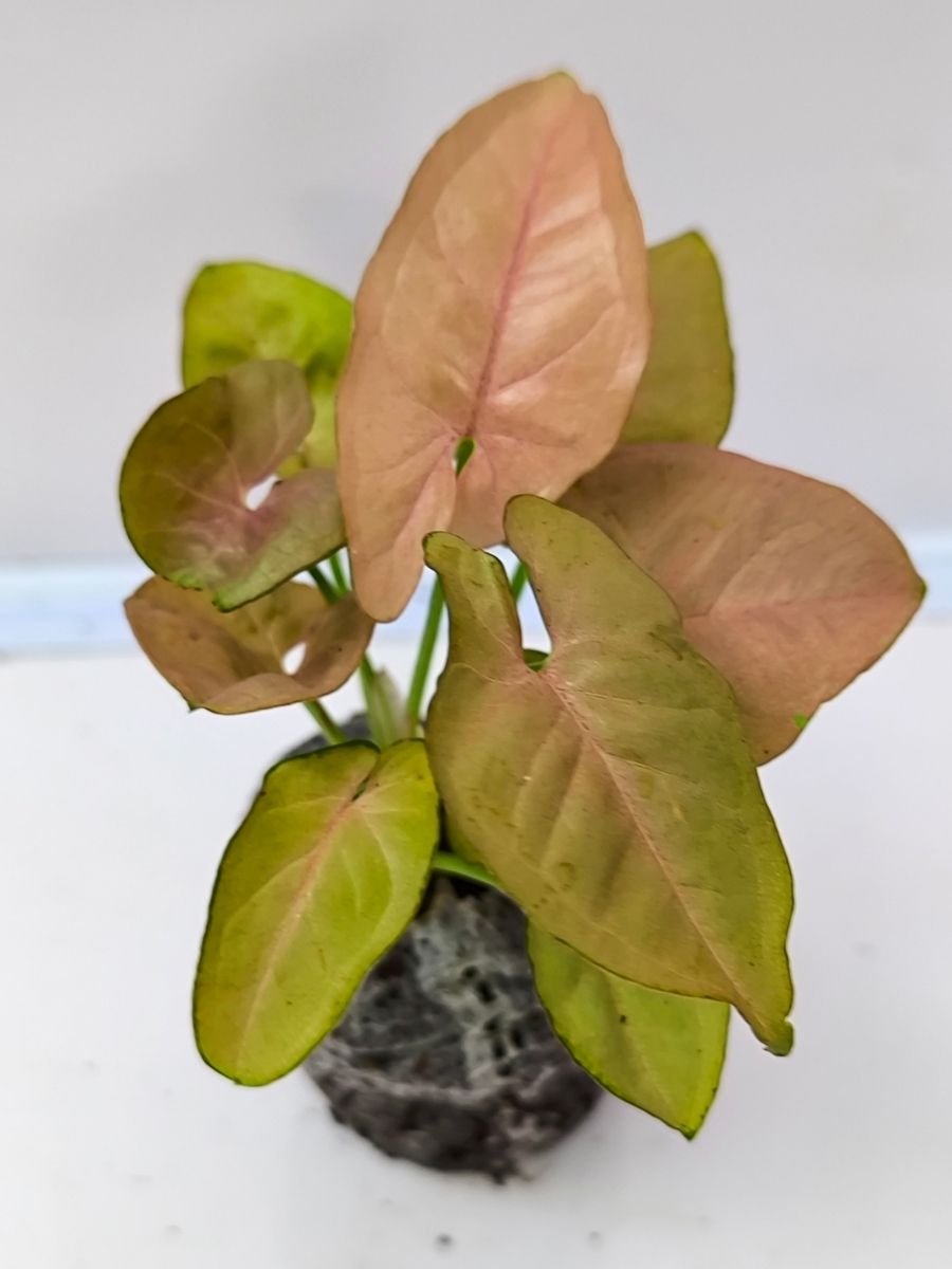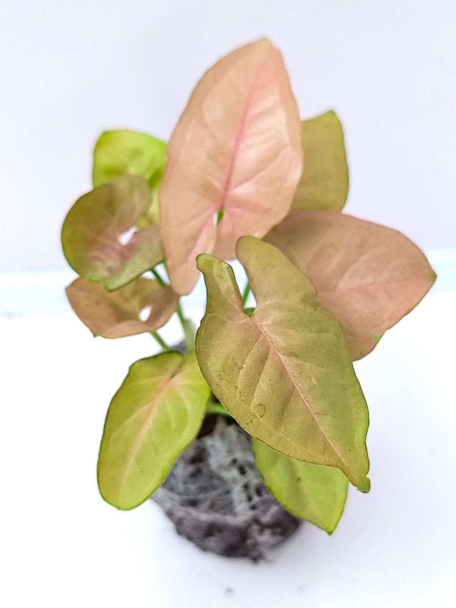 A healthy Syngonium Neon Pink plant in a jiffy bag.